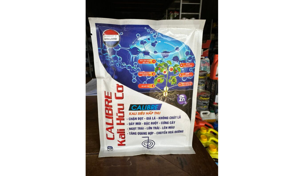 CALIBRE KALI HỮU CƠ RỒNG LỬA là sản phẩm kali hữu cơ dạng bột, giúp cây trồng hấp thụ nhanh giúp trái to tròn, chắc nhân, nặng thịt. Ngoài ra Calibre còn được sử dụng để làm già lá, chặn đọt hiệu quả vì có bổ sung thêm kẽm chelate.