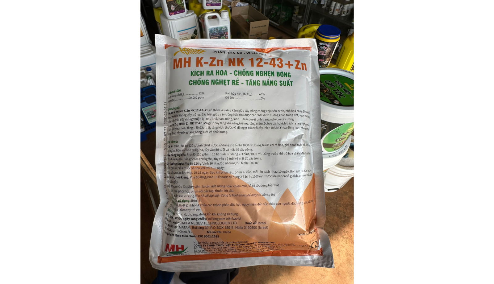 • Thành phần chính: Đạm (Nts) 12%, Kali hữu hiệu (K₂Ohh) 43%, Kẽm (Zn) 20.000 ppm.