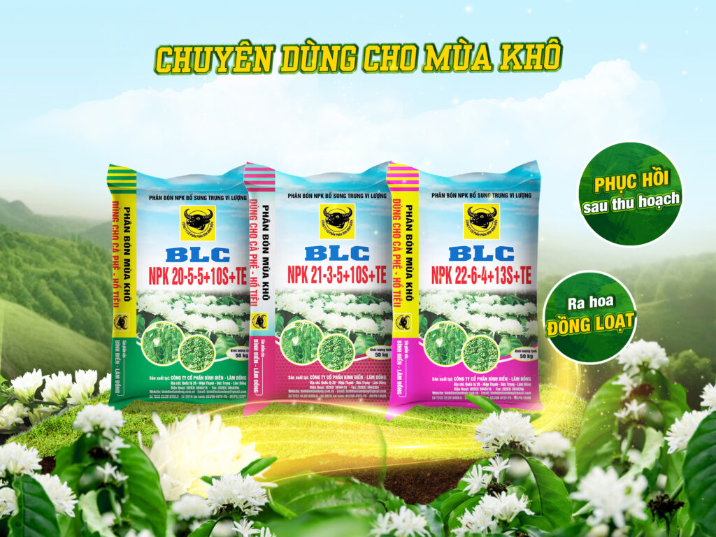 Phân NPK chuyên dùng cho cà phê mùa khô: có hàm lượng Kali cao giúp cây tăng sức chống chịu và hạn chế rụng lá.