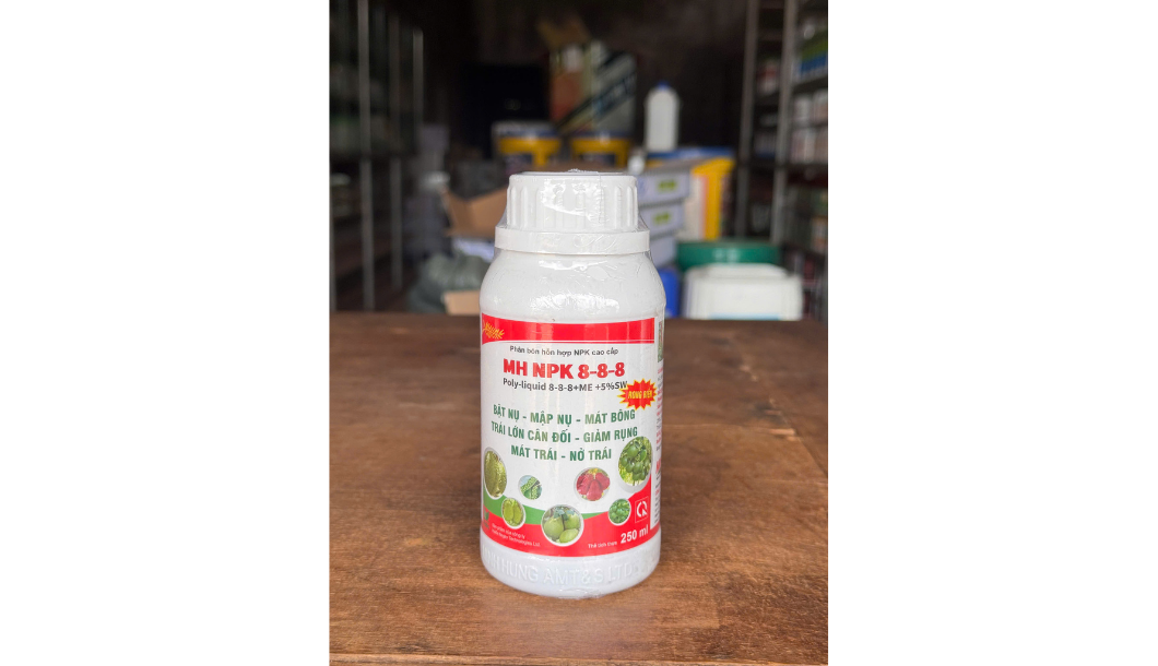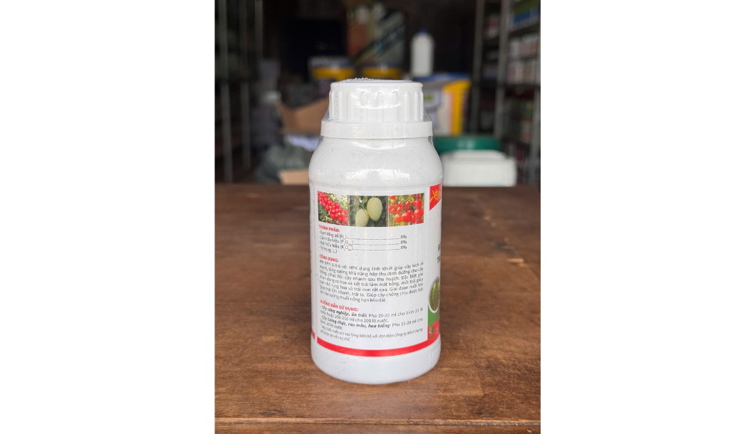 BẬT NỤ, MẬP NỤ, MÁT BÔNG. TRÁI LỚN CÂN ĐỐI, CHỐNG RỤNG BÔNG TRÁI NON. MÁT TRÁI, NỞ TRÁI, GIAI ĐOẠN NUÔI TRÁI GIÚP TRÁI LỚN NHANH. GIÚP CÂY CHỊU ĐƯỢC BẤT LỢI NHƯ SƯƠNG MUỐI, NẮNG HẠN KÉO DÀI. THÀNH PHẦN: N 8% P2O 8% K20 8% Thể tích: 250ML Thành phần: NPK 8-8-8 + vi lượng + rong biển
